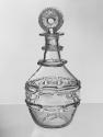 DescriptionDecanter: blown and finished by tooling. The semi-barrel-shaped body is decorated with two bands of applied chain decoration, the upper with 11 links, the lower with 9. The neck has two triple neck rings and a flanged lip. Slightly concave base. Rough, solid pontil mark. Capacity: about 1 pint. Stopper: pressed.