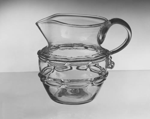 DescriptionBlown and finished by tooling. The semi-barrel-shaped body is decorated with two bands of applied chain decoration, the upper with 11 links, the lower with 9. Semi-ear-shaped applied handle with crimped and upturned end. Rough, solid pontil mark on slightly concave base.