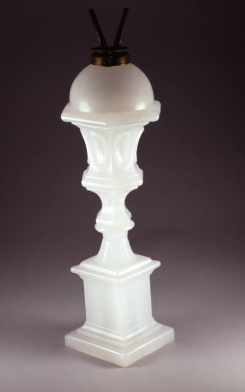 DescriptionHigh-domed hexagonal font and stem pressed upright in a female mold of three vertical sections bearing the pattern, in conjunction with a one-piece cylindrical mold from which the domed top was formed by reheating and tooling by the Magoun patent method, by a plain male plunger. Joined by a wafer to an octagonal standard on a square pedestal on a square plinth. Standard and base pressed upside down in a female mold of four vertical sections by a plain male plunger. Remains of pontil mark on underside of outer edge of base that is partly rough-ground. Brass collar machined and threaded, fitted with brass double-wick burner for burning fluid.