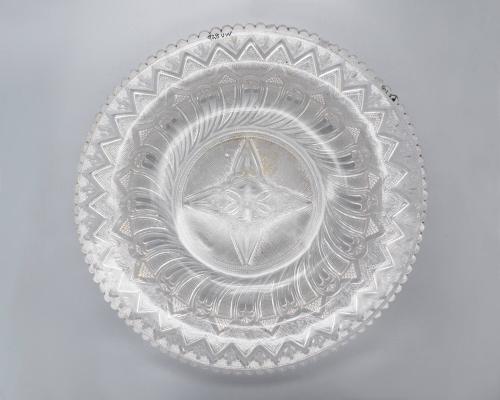DescriptionPressed upside down over a plain male mold by a female plunger bearing the pattern. Rope foot ring. Shear mark on patterned underside of base.