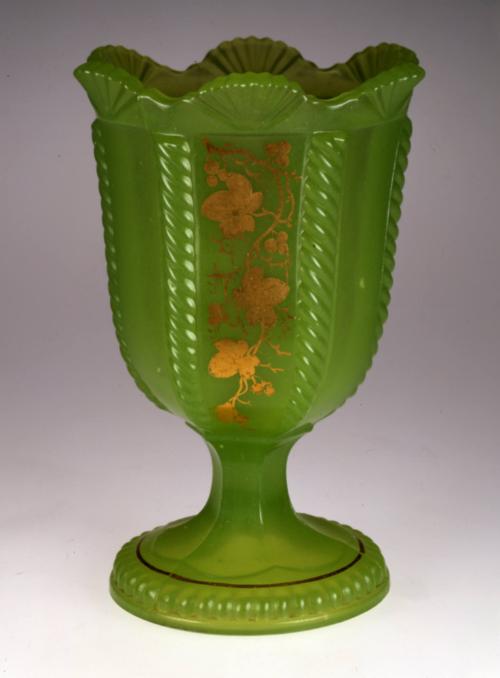 DescriptionPressed in a female mold of three vertical sections bearing the Cable pattern that formed the exterior of the piece except for the top edge of the fans and the underside of the foot, by a male plunger that formed the interior of the bowl and the top edge of the fans, in conjunction with a second male plunger, or plug, that formed the hollow interior of the foot and its slightly curved outer edge. The moldmarks extend from the lower edge of the foot vertically to the left edge of three of the cables to the outer right end of three of the fans. Three alternate panels are gilded with a stylized grapevine and grapes. No pontil mark.