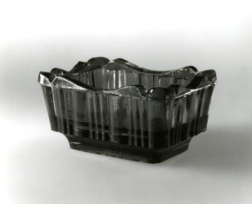 DescriptionPressed upright in a one-piece female mold bearing the pattern that formed the entire exterior, including the foot rim and the recessed base bearing a stylized floret made up of twelve pointed petals of various lengths around a small boss, with a cap ring that formed the side and upper surface of the rim, by a male plunger plain except for the plain fillet on the bottom of the sides and ends of the interior. No fire-polishing. No pontil mark.
