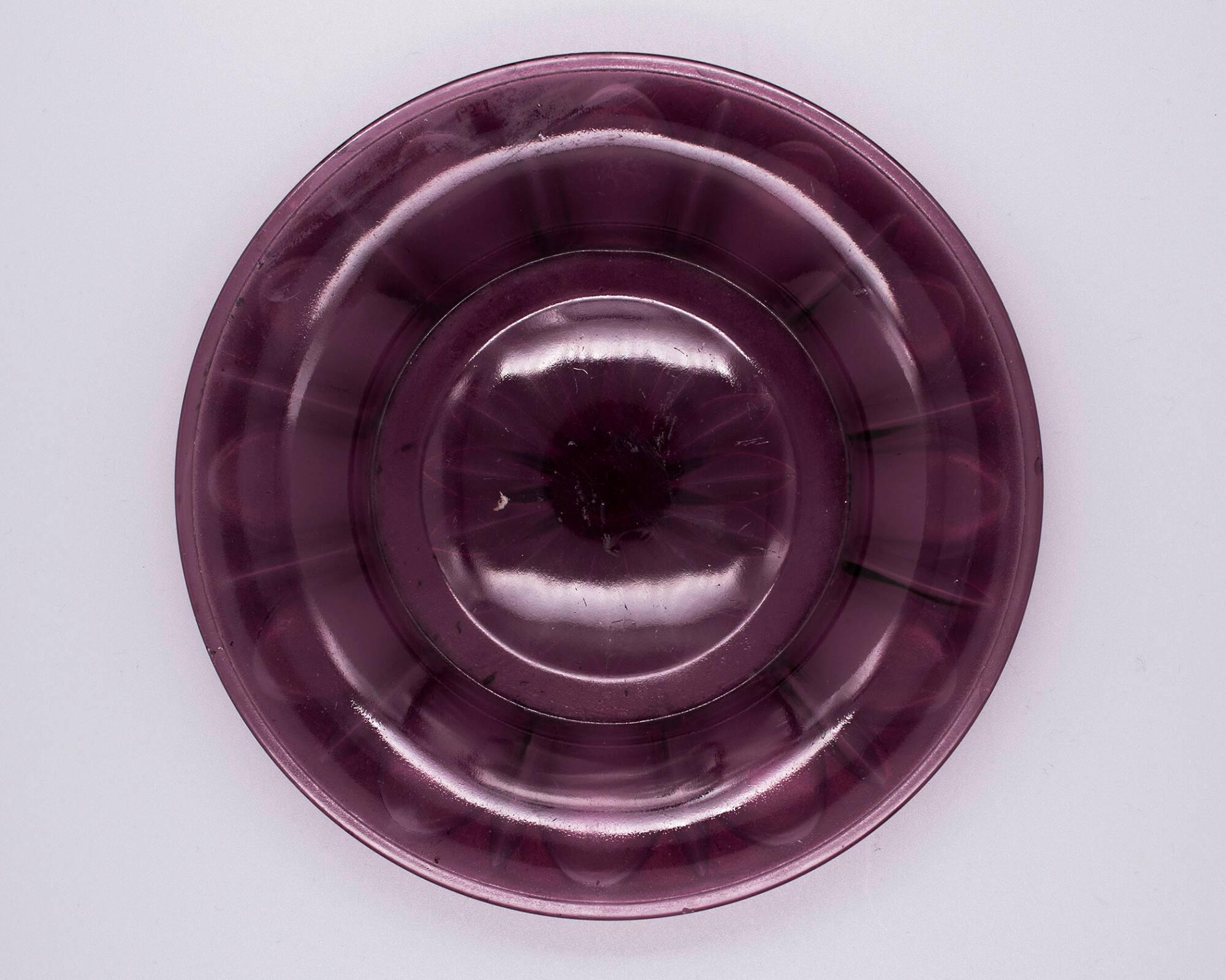 DescriptionPressed, probably upside down, over a plain male mold, with a cap ring that formed the rim, by a female plunger bearing the Bigler pattern. No fire-polishing. No pontil mark.