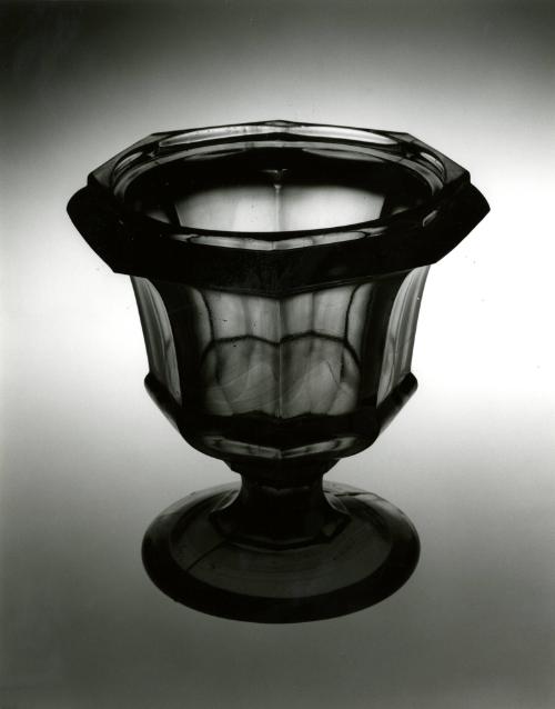 DescriptionPressed upright in a female mold of two vertical sections bearing a pattern of eight flat panels on the bowl and stem that formed the interior of the bowl and upper surface of the rim, with a slightly convex base plate with flat outer shoulder that formed the underside of the foot, by a plain male plunger. The moldmarks rise from the bottom edge of the foot to the top edge of the rim. Rim fire-polished. Polished outer edges of underside of foot and pontil mark.
