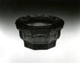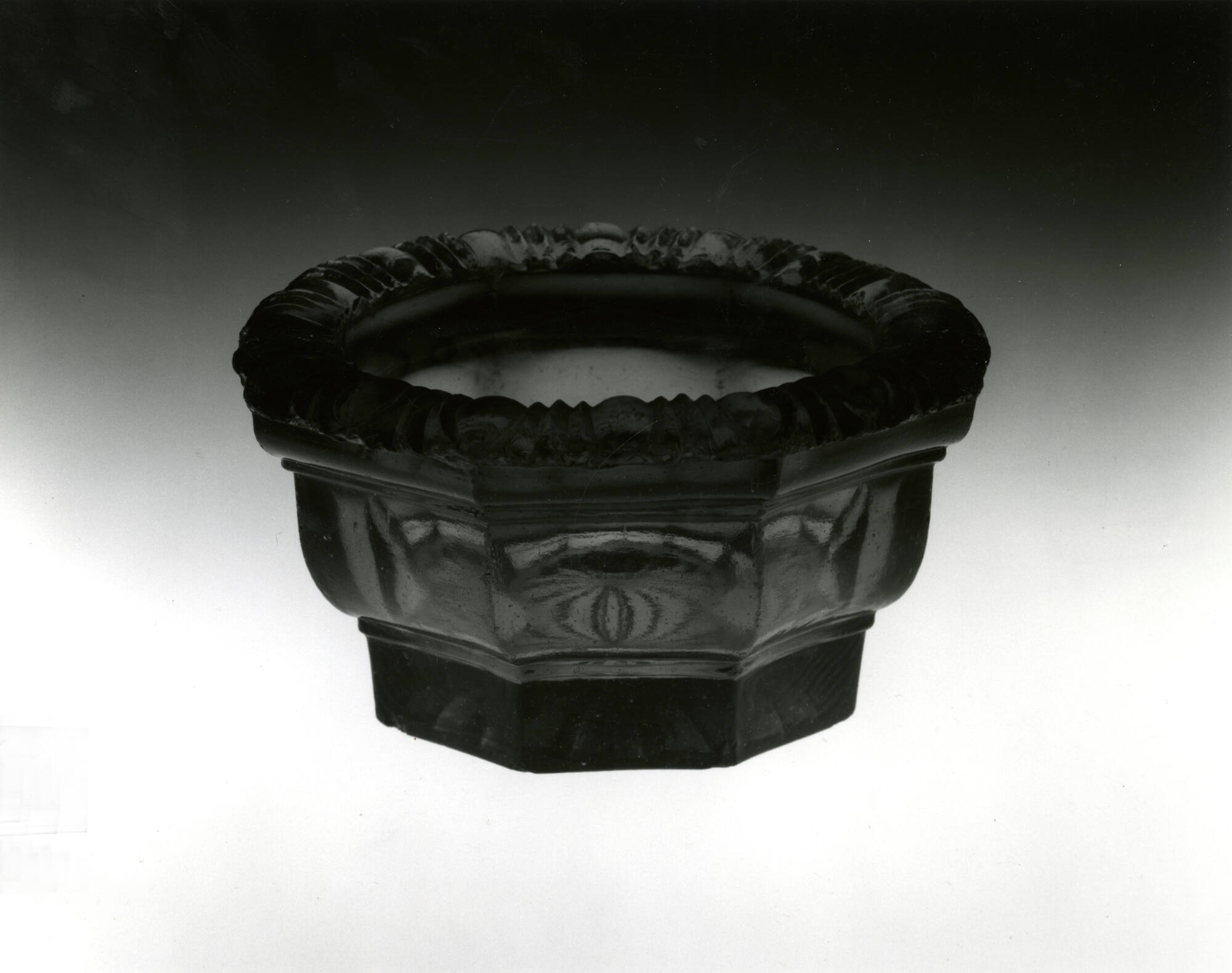 DescriptionPressed upright in the same manner and in the same type of mold as 1965.13, but the pattern on the underside of the octagonal base is a sixteen-pointed star. A cap ring bearing an egg-and-dart motif formed the side and top of the rim. No fire-polishing. No pontil mark.
