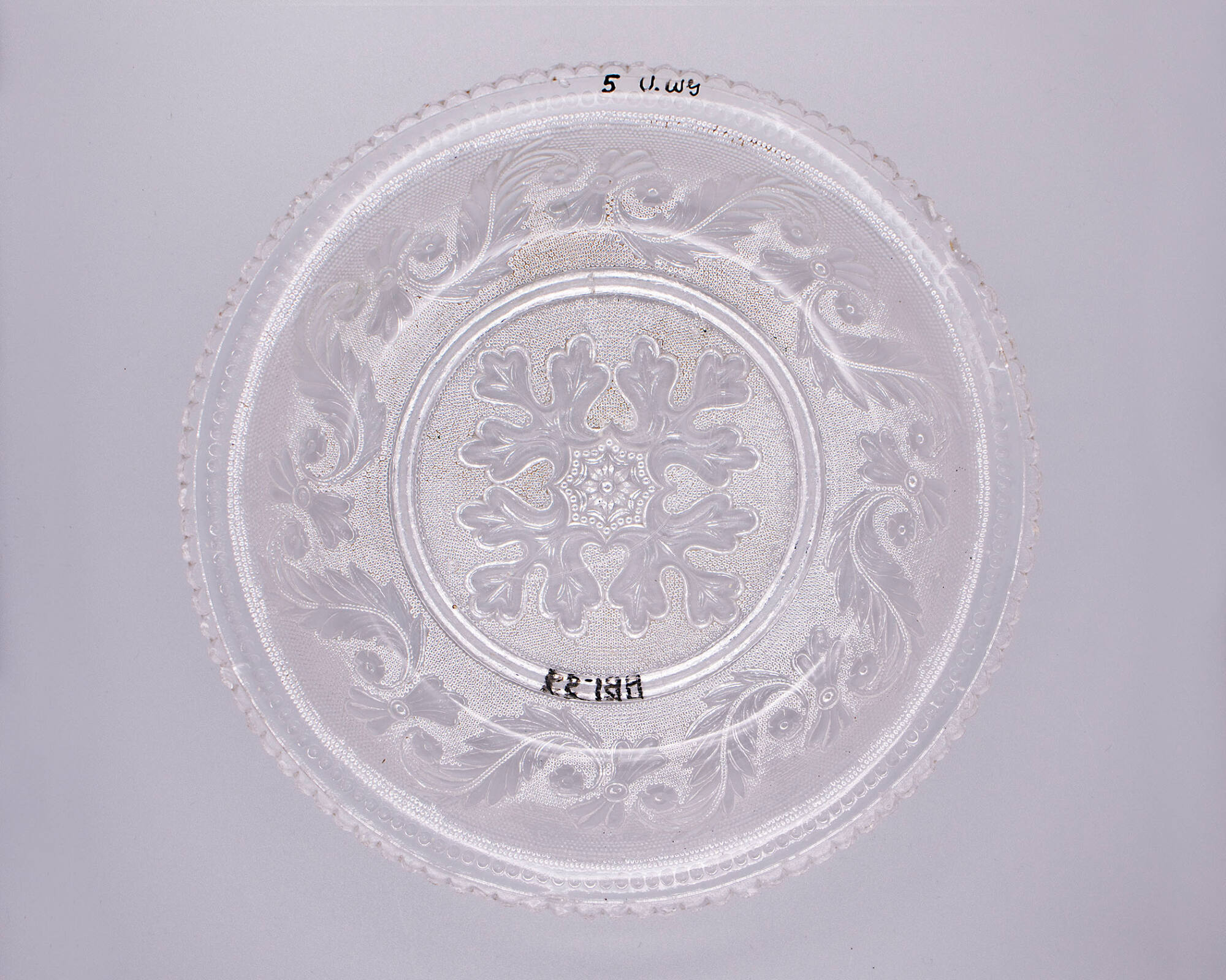 DescriptionPressed, probably upright in a female mold bearing the oak-leaf pattern by a plain male plunger. Plain, rounded foot ring. A prominent wrinkle on the plain interior surface may be the shear mark.