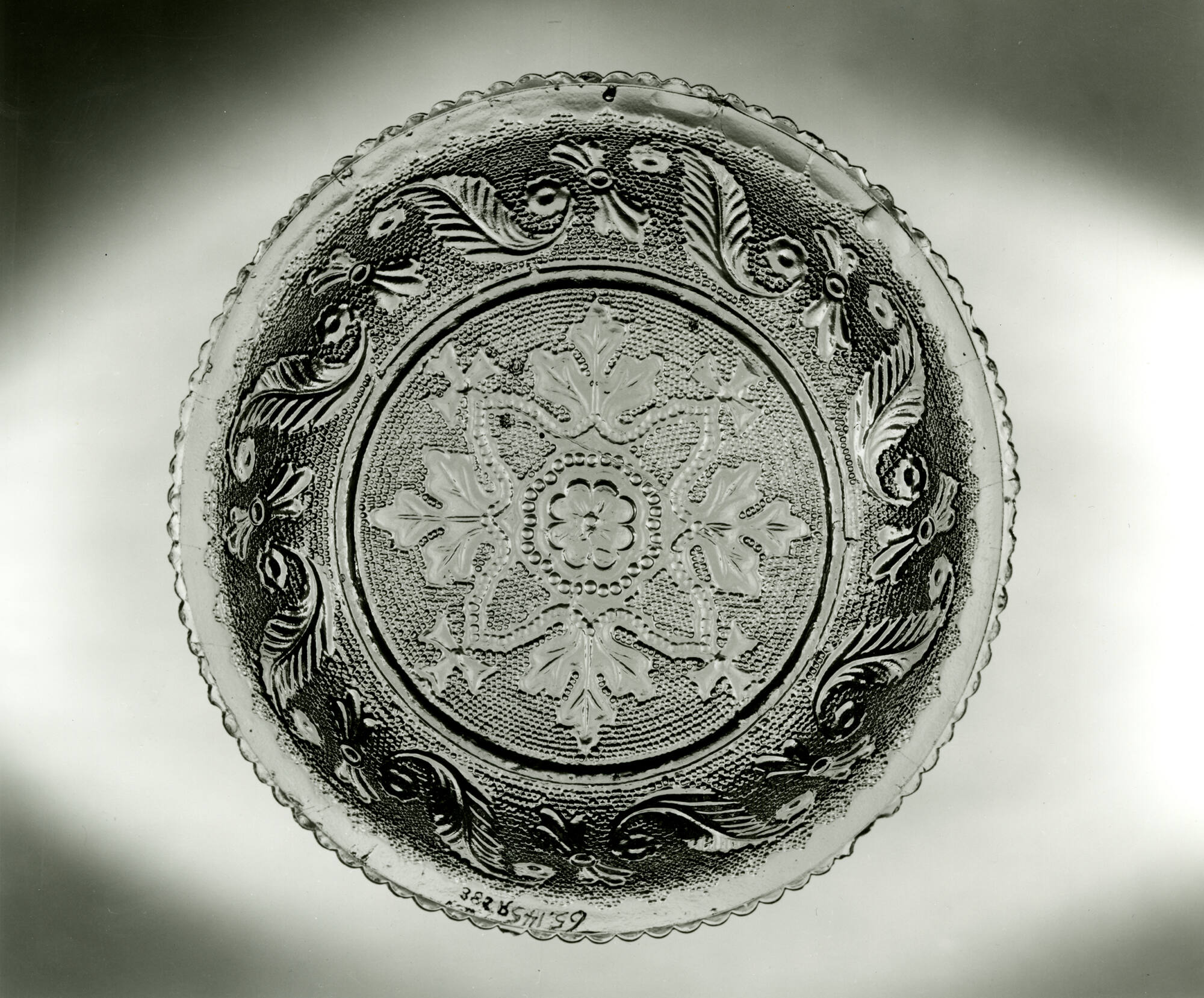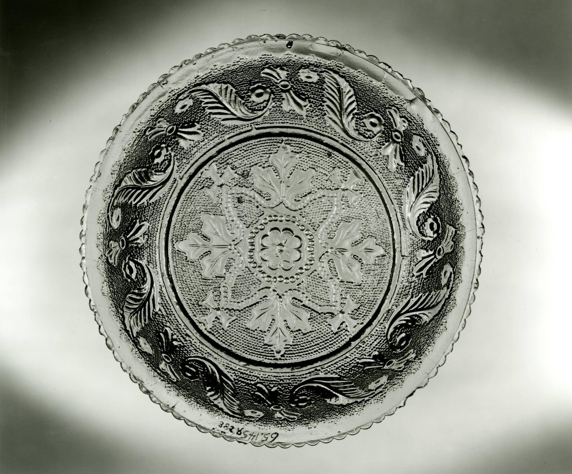 DescriptionPressed in the same manner and possibly in the same mold as 1965.150, modified to produce a different border pattern below the rim.
