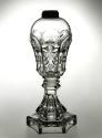 DescriptionFont pressed upright in a female mold of three vertical sections bearing the pattern, in conjunction with a one-piece cylindrical mold from which the domed top and lip were formed by reheating and tooling, by the Magoun patent method, by a plain male plunger. Joined by a wafer to a hexagonal standard on a scalloped base. Standard and base pressed in a female mold of two vertical sections by a plain male plunger of cylindrical and hexagonal shape that formed the hollow interior, with a cap ring that formed the underside of the perimeter of the base and a short triangular section on each edge leading to each side. No pontil mark. Brass collar machined and threaded.