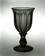 DescriptionPressed upright in a female mold of two vertical sections bearing the pattern of eight flutes that formed the bowl, stem, and foot, with a plain base plate with a shallow dome that formed the underside of the foot, by a plain male plunger, probably with a cap ring that formed the rim. Rim fire-polished and probably slightly tooled. Semipolished pontil mark.