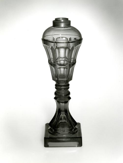 DescriptionFont with short stem pressed upright in a female mold of three vertical sections bearing the Bigler pattern by a plain male plunger; the plain cylindrical top reheated and tooled to form the domed top (the three moldmarks are still evident). Joined by a wafer to a double knop above an octagonal standard on a square plinth. Standard and plinth pressed upside down in a female mold of two vertical sections opening at the centers of two opposite sides of the base, in conjunction with a one-piece female mold that formed the square plinth with small chamfered corners, by a plain male plunger of tapered cylindrical and square form. Rough pontil mark around edge of opening to standard. Pewter collar machined and threaded to accept burner.