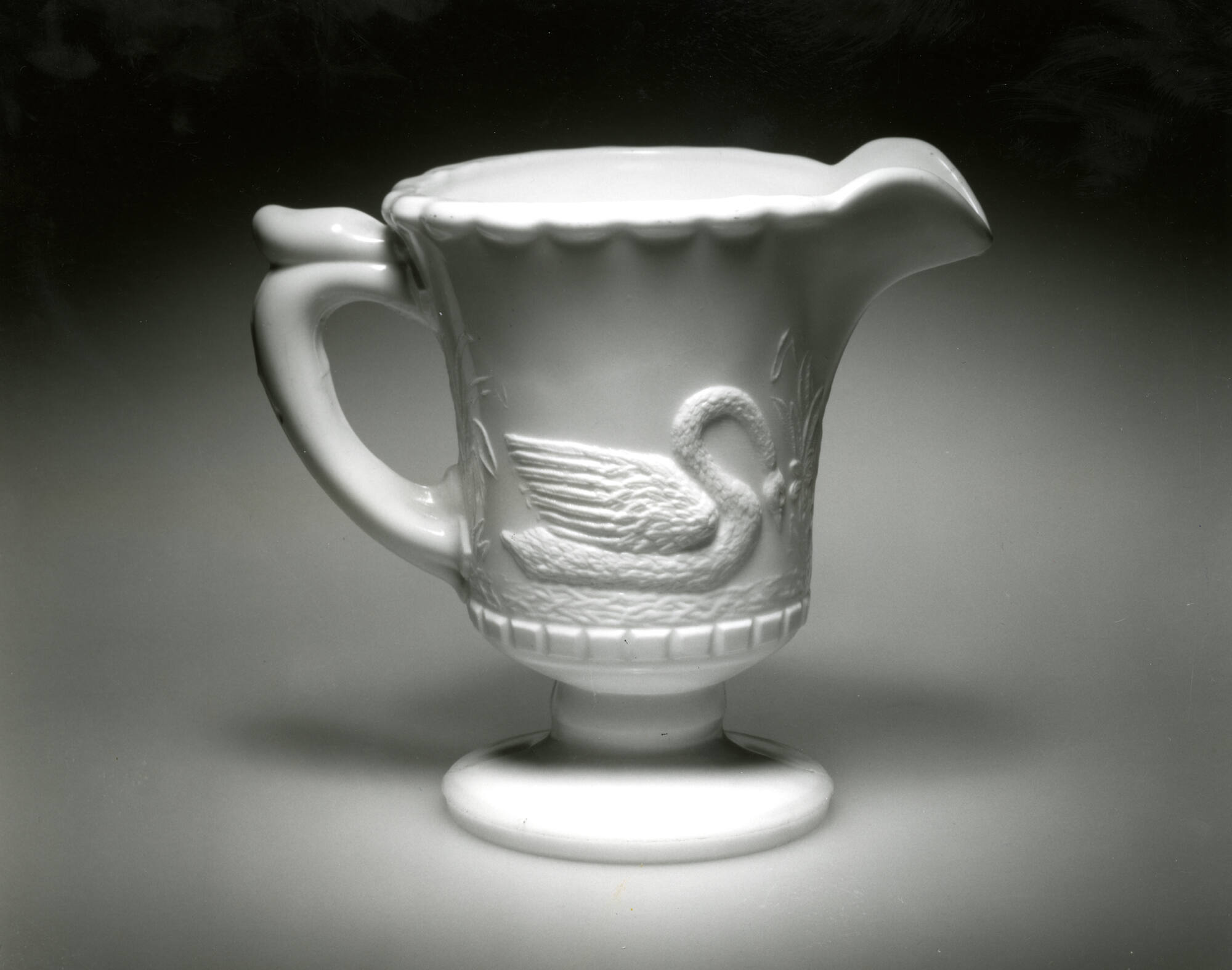 DescriptionPressed upright in a female mold of two vertical sections bearing the pattern of two different swans and plants on the body, with a base plate that formed the lower edge of the foot and the domed underside, with a cap ring that formed the scalloped rim, by a male plunger. The moldmarks extend from the top edge of the foot vertically through the center of the handle and the spout to the rim. Rim heavily fire-polished. No pontil mark.
