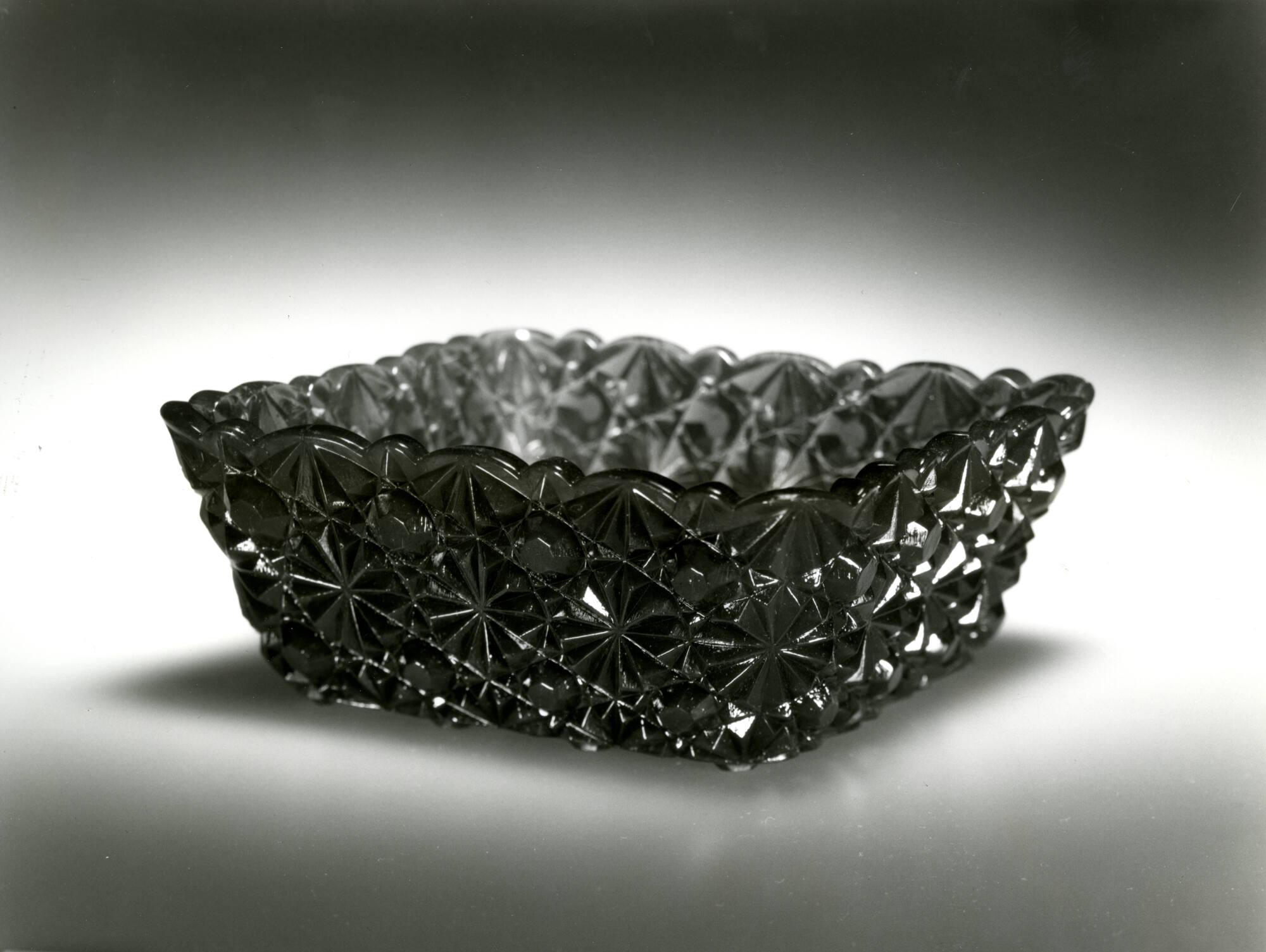DescriptionPressed upside down over a plain male mold that formed the interior and perhaps the top of the scalloped rim, with a top plate that formed the exterior of the square base, by a female plunger, probably of two vertical sections, that formed the sides. Rim fire-polished. No pontil mark.