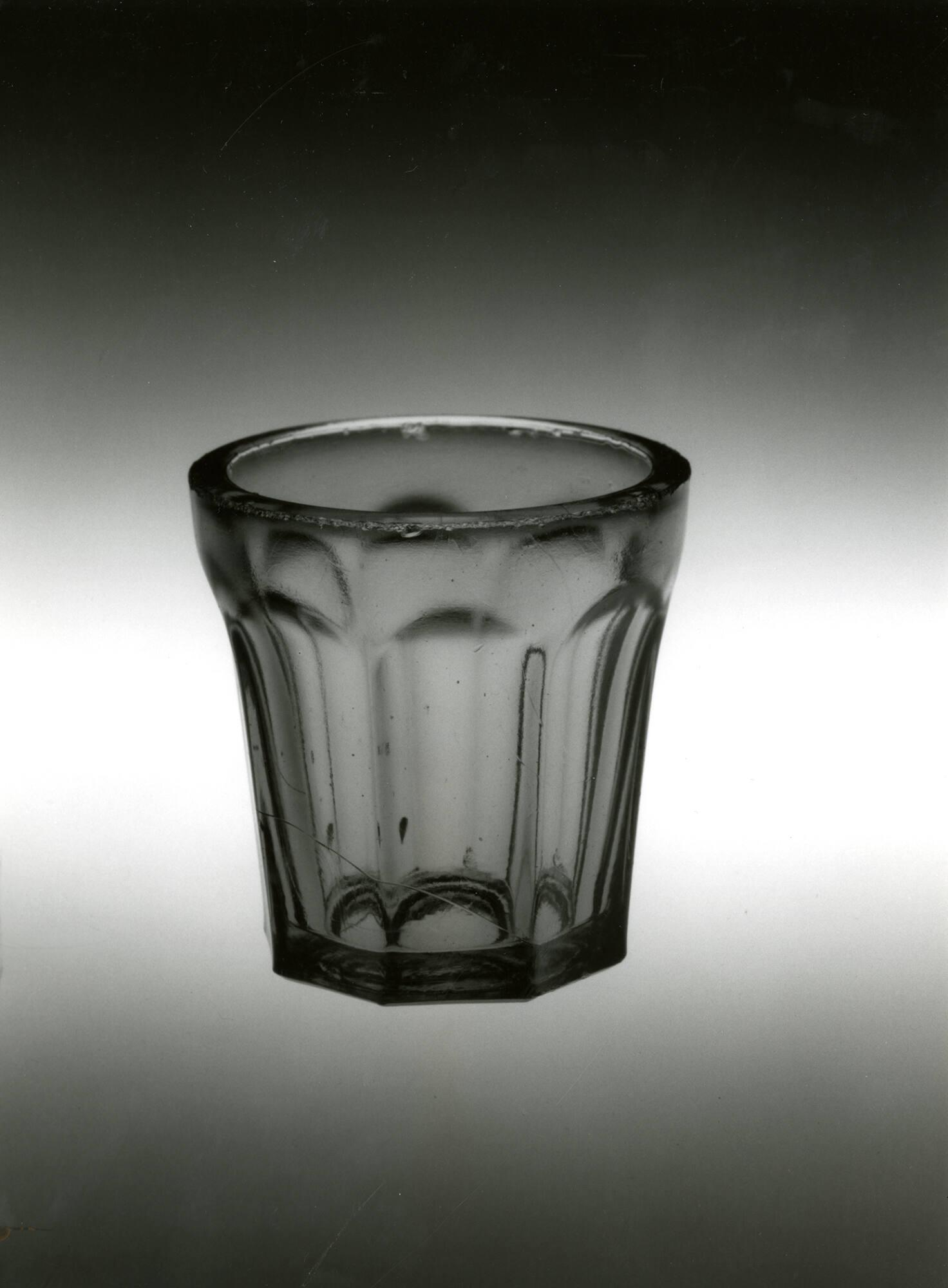 DescriptionPressed, probably upright, in a female mold with an undetermined number of vertical sections bearing a pattern of eight flutes, with a base plate with a low boss in the center that formed the underside of the base, with a cap ring that formed the top of the rim, by a plain male plunger. No fire-polishing. No pontil mark.