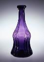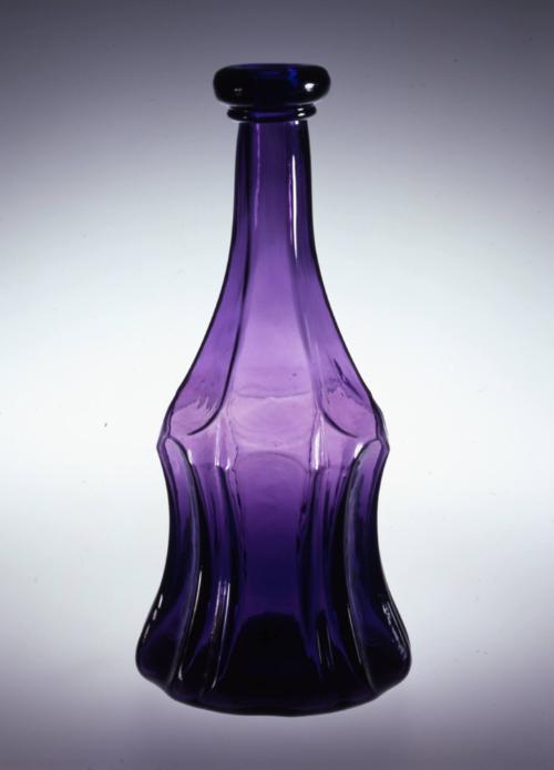 DescriptionBlown in a mold of three vertical sections, bearing a pattern of six broad panels alternating with six narrow panels, and a plain base plate. Applied gather tooled to form the bar lip and the collar beneath it. Polished pontil mark.