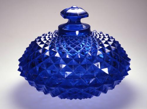 DescriptionBowl: pressed in a one piece female mold bearing the Mitre Diamond pattern, with a cap ring that formed the Mitre Diamond rim, by a plain male plunger. No pontil mark. No fire-polishing. Cover: pressed upside down in a one-piece female mold in the same manner as the bowl, in conjunction with a two-piece female mold that formed the finial and its stem, with a cap ring that formed the Mitre Diamond rim, by a plain male plunger. No fire-polishing. No pontil mark.