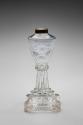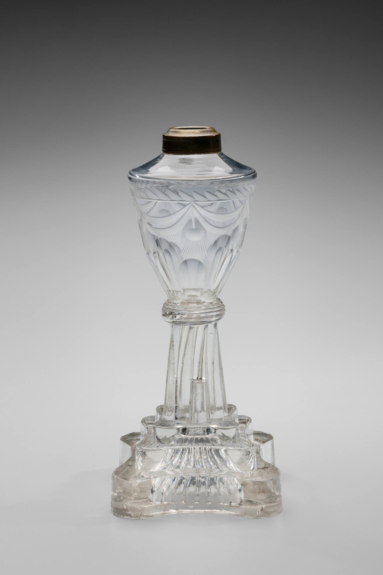 DescriptionFont blown and finished by tooling. Joined by a finely ribbed knop to a stepped base. Base machine pressed upside down in female mold by a plain male plunger. Rough ground on the underside, with no evidence of a pontil mark. Font cut with a pattern of unpolished swags and tassels with a border above and a series of polished flats of alternate heights below. Brass collar machined and threaded.