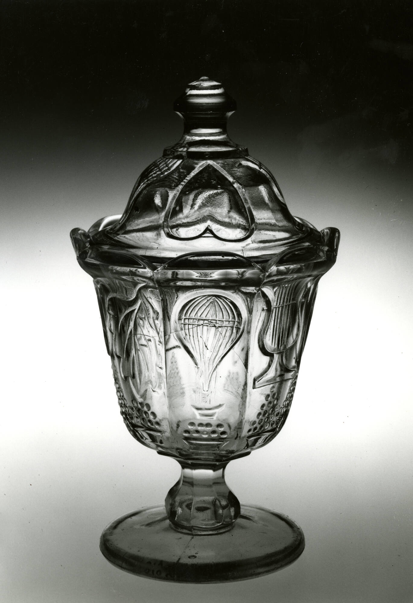 DescriptionBowl: pressed upright in a female mold of two vertical sections bearing the so-called balloon pattern (each section bearing four panels depicting a balloon, a harp, a heart, or a leaf above a container of balls), with a base plate that formed the lower edge and underside of the base, with a cap ring that formed the upper and inner surfaces of the scalloped rim, by a plain male plunger. The moldmarks extend from the lower edge of the foot to the rim. Rim fire-polished. No pontil mark. Cover: pressed upside down in a one-piece female mold bearing four panels to match the bowl, in conjunction with a two-piece plain female mold that formed the finial and a one-piece female mold that formed the rest of the exterior, probably with a cap ring that formed the underside of the rim, by a plain male plunger. No fire-polishing. No pontil mark.