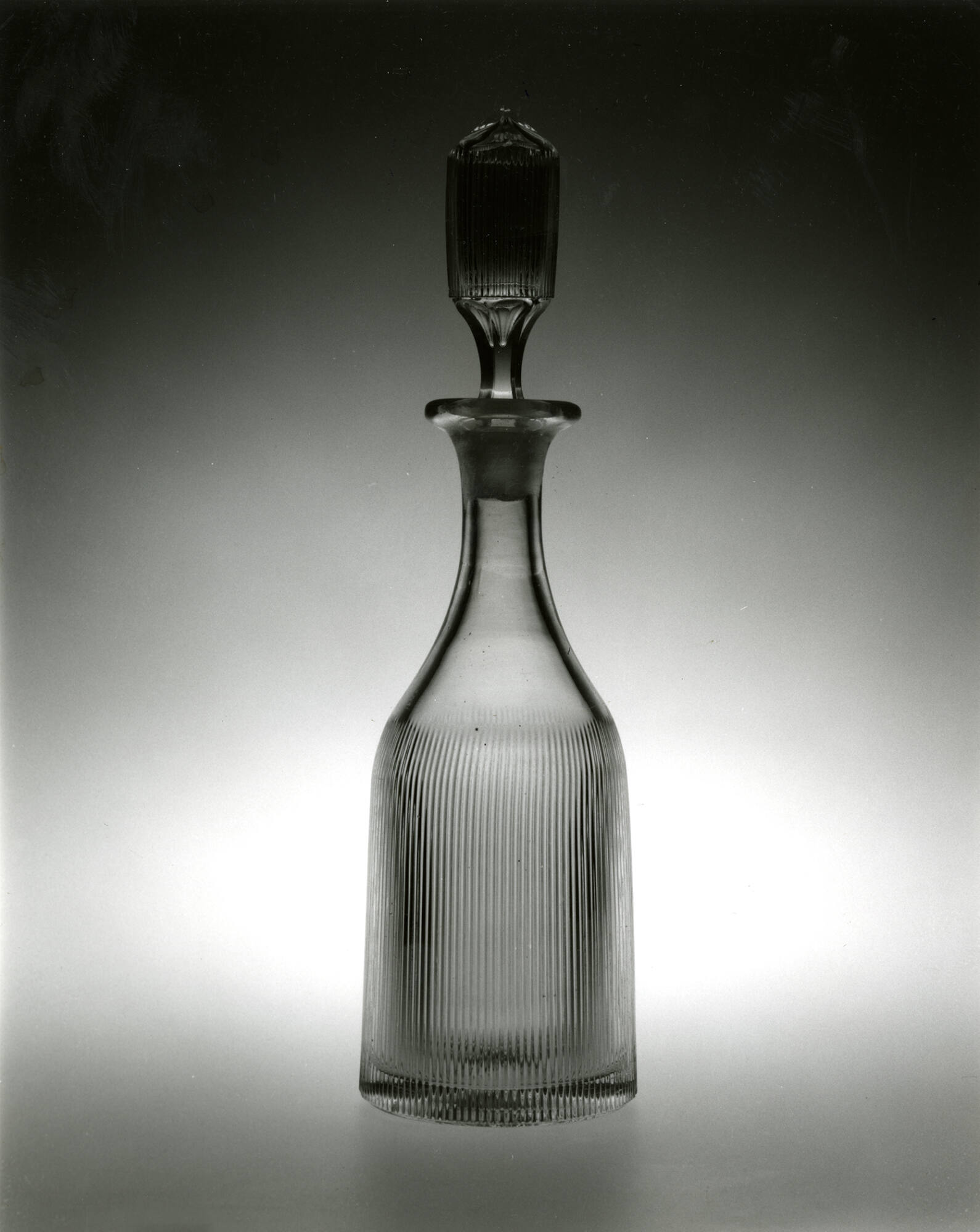 DescriptionDecanter: pressed, probably upright, in a female mold, probably of two vertical sections in the form of a cylinder bearing the Reeded pattern with a plain section above, with a plain base plate that formed the base, by a plain cylindrical male plunger. The plain upper section reheated and tooled to form the neck and heavy flange lip. Polished pontil mark. The interior of the neck rough ground to receive a stopper. Capacity: 1 quart. Solid stopper: pressed upright in a female mold of two vertical sections bearing the Reeded pattern with a plain cylindrical top above that was closed by tooling. Top of the stopper cut and polished; lower end rough ground to fit the neck of the decanter.