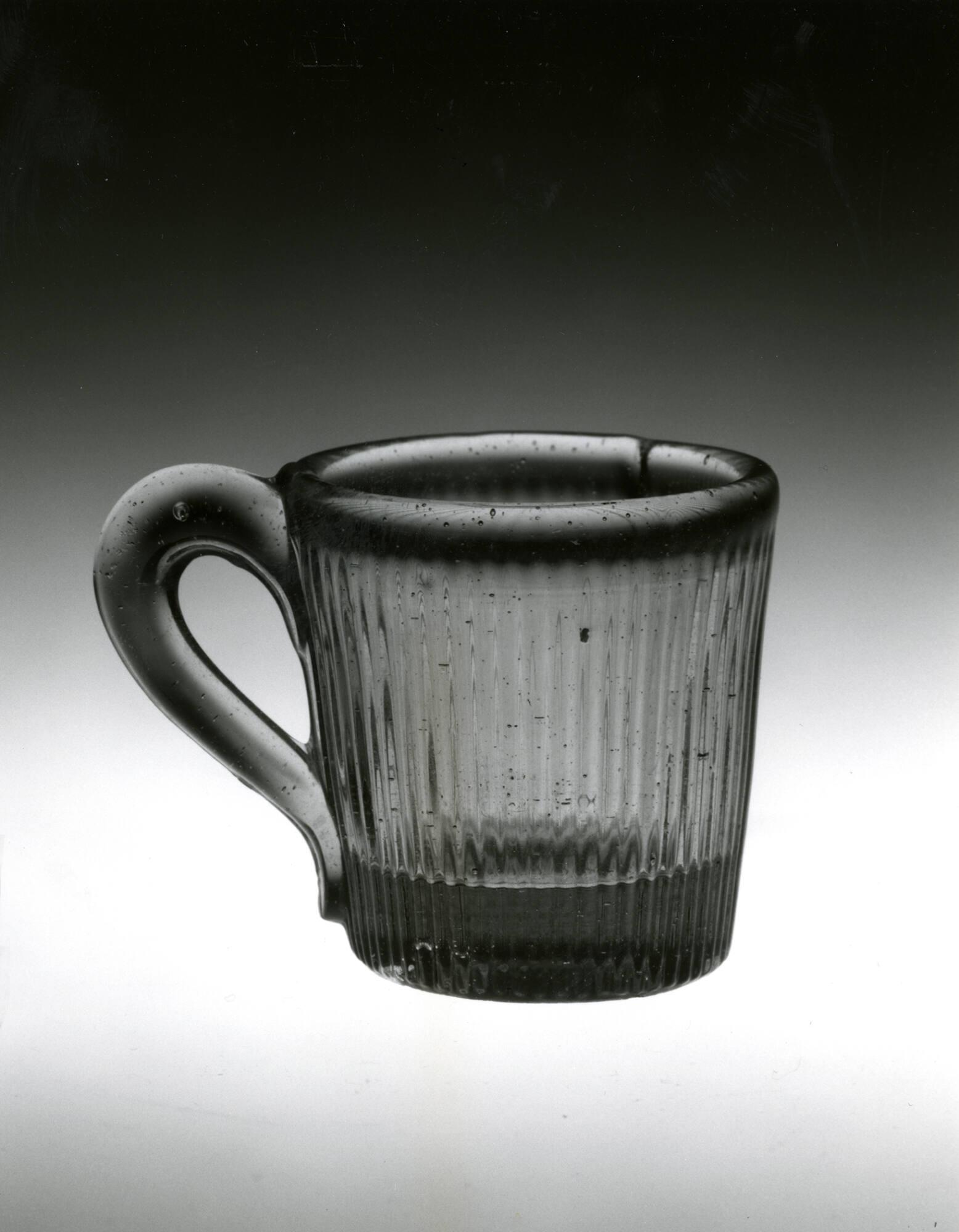 DescriptionPressed upright in a female mold of three vertical sections bearing a pattern of fine ribs, with a base plate with a broad shallow boss that formed a hollow in the base, probably with a cap ring that formed the top of the rim, by a plain male plunger. One of the moldmarks extends vertically through the handle. Rim fire-polished. Outer edge of underside of base ground and semipolished.