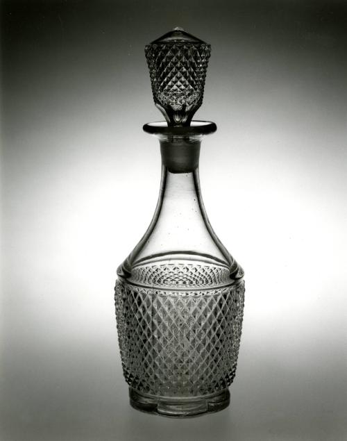 DescriptionDecanter: pressed upright in a female mold of three vertical sections in the form of a slightly tapered large tumbler bearing the pattern for the six-lobed foot, the Sharp Diamond pattern, and the short plain section above it, in conjunction with a one-piece female mold that formed a plain cylinder above, with a plain flat base plate that formed the base, by a plain male plunger. Stuck up and the cylinder reheated, then tooled to form the neck and lip. Neck rough-ground to receive a stopper. Lip fire-polished. Pontil mark ground and polished. Capacity: 1 quart. Stopper: pressed upright in a two-piece mold bearing the pattern with a plain one-piece cylindrical mold above. Cylinder reheated and tooled to form the pointed top. Bottom end rough-ground to fit decanter.