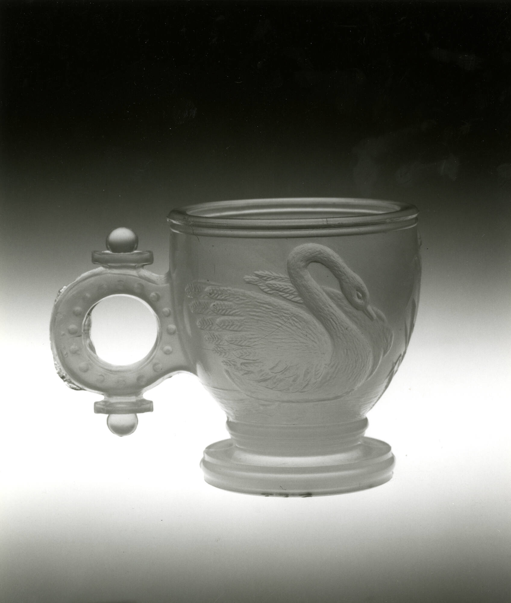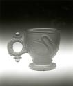 DescriptionPressed upright in a female mold of two vertical sections bearing the so-called swan pattern, with a base plate that formed the underside of the base, by a plain male plunger. The moldmarks are at the center of the handle and opposite it in front. No fire-polishing. No pontil mark.