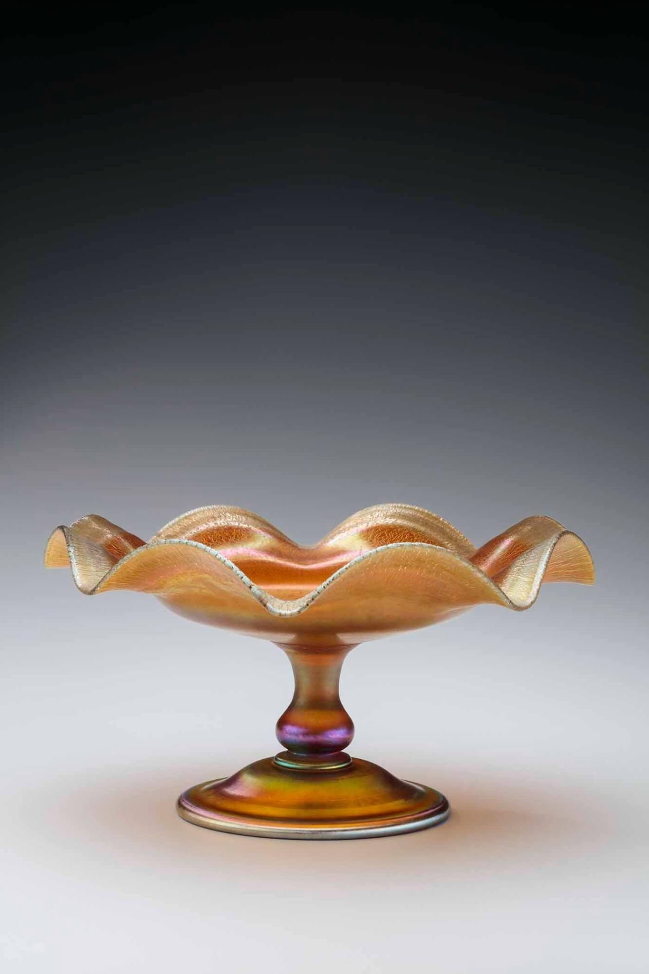 DescriptionBlown and finished by tooling. Applied solid tooled stem. Applied blown and tooled foot with underfolded rim. Greenish-reddish gold iridescent finish. Rough pontil mark.