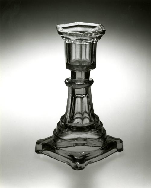 DescriptionSocket and stem pressed upright in a female mold of two vertical sections by a plain male plunger that formed the socket and the hexagonal shoulder. Joined by a wafer to a short hexagonal standard and base. Standard and base made in the same manner as that used for 1966.34 and with the same type of pontil mark. Lightly fire-polished.