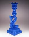 DescriptionPetal socket and stem pressed upright in a female mold of three vertical sections bearing the pattern by a plain cylindrical male plunger rounded at the end, with a cap ring that formed the upper part of the petals. Joined by a wafer to a base in the form of a dolphin on a double-stepped square plinth with one flat knop above the dolphin. Base pressed upside down in a female mold of two vertical sections bearing the pattern by a plain male plunger that formed the hollow interior of the double base and a round-ended rectangular hollow projecting about 1.0 cm (1/3 in.) into the dolphin's head.