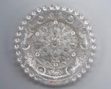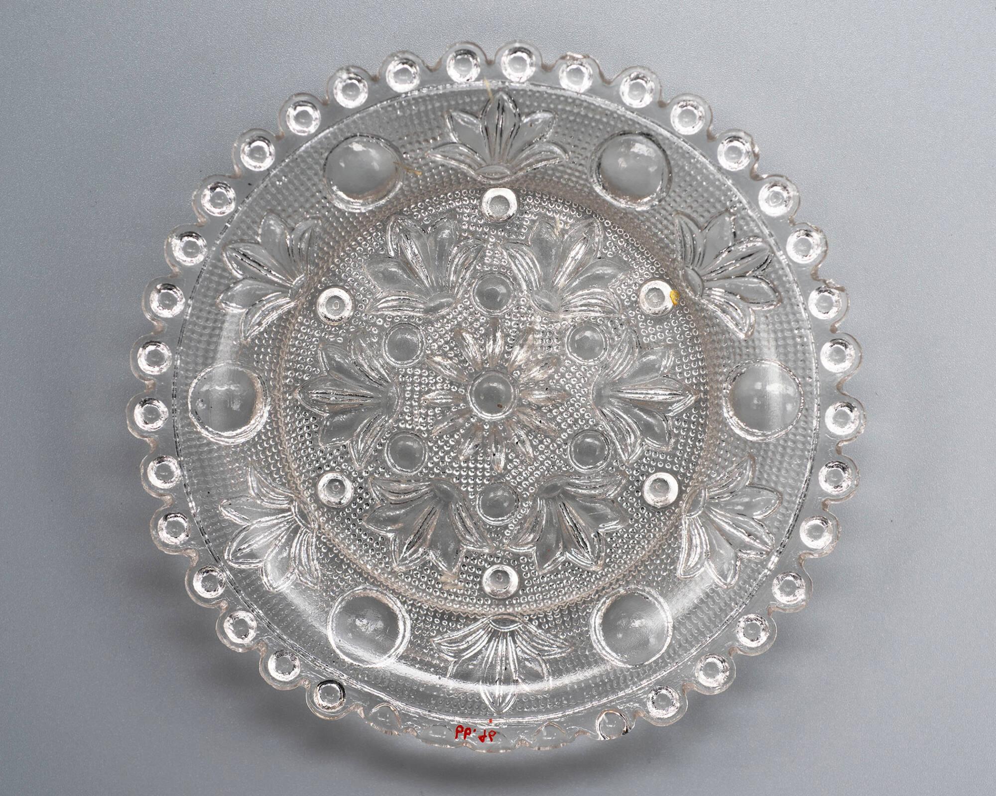 DescriptionPressed upside down over a plain male mold by a female plunger bearing the pattern. The piece rests on sixteen bull's-eye bosses around the edge of the base.