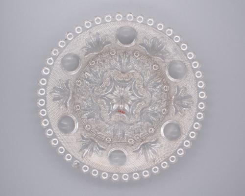 DescriptionPressed upside down over a plain male mold by a female plunger bearing the pattern. The piece rests on twelve bull's-eye bosses around the edge of the base.