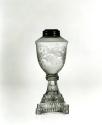 MediumColorless glass; blown, tooled, mold-pressed, stone wheel engraved. Stamped brass collar, possibly a later replacement.