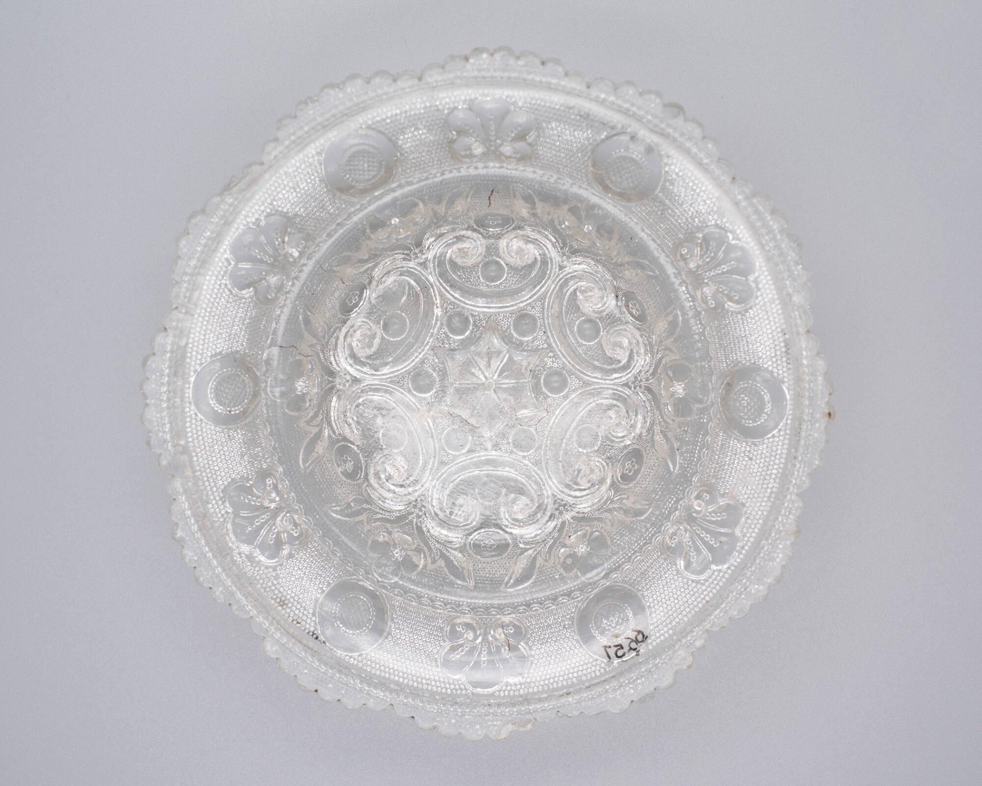 DescriptionPressed, probably upright, in a female mold bearing the pattern by a plain male plunger. Slight evidence of shear mark on plain interior surface. The piece rests on the points at the ends of the scrolls.