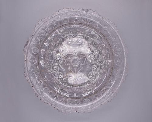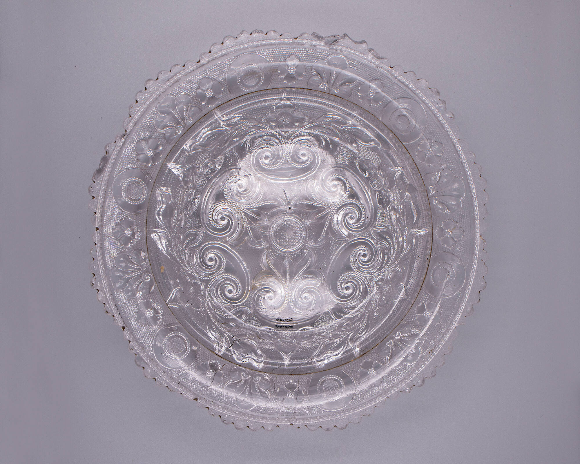 DescriptionPressed upright in a female mold bearing the same pattern by a plain male plunger. No foot ring; the piece rests on three of the C scrolls. Shear mark evident on plain interior surface.