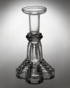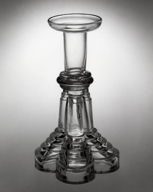 DescriptionSocket blown and finished by tooling. Joined by three heavy wafers to a standard and base. Standard and base pressed upside down in a one-piece female mold by a plain male plunger of tapered quatrefoil cross section that formed the hollow standard and underside of the base. Rough pontil mark at corners of quatrefoil where interior of base and standard meet.