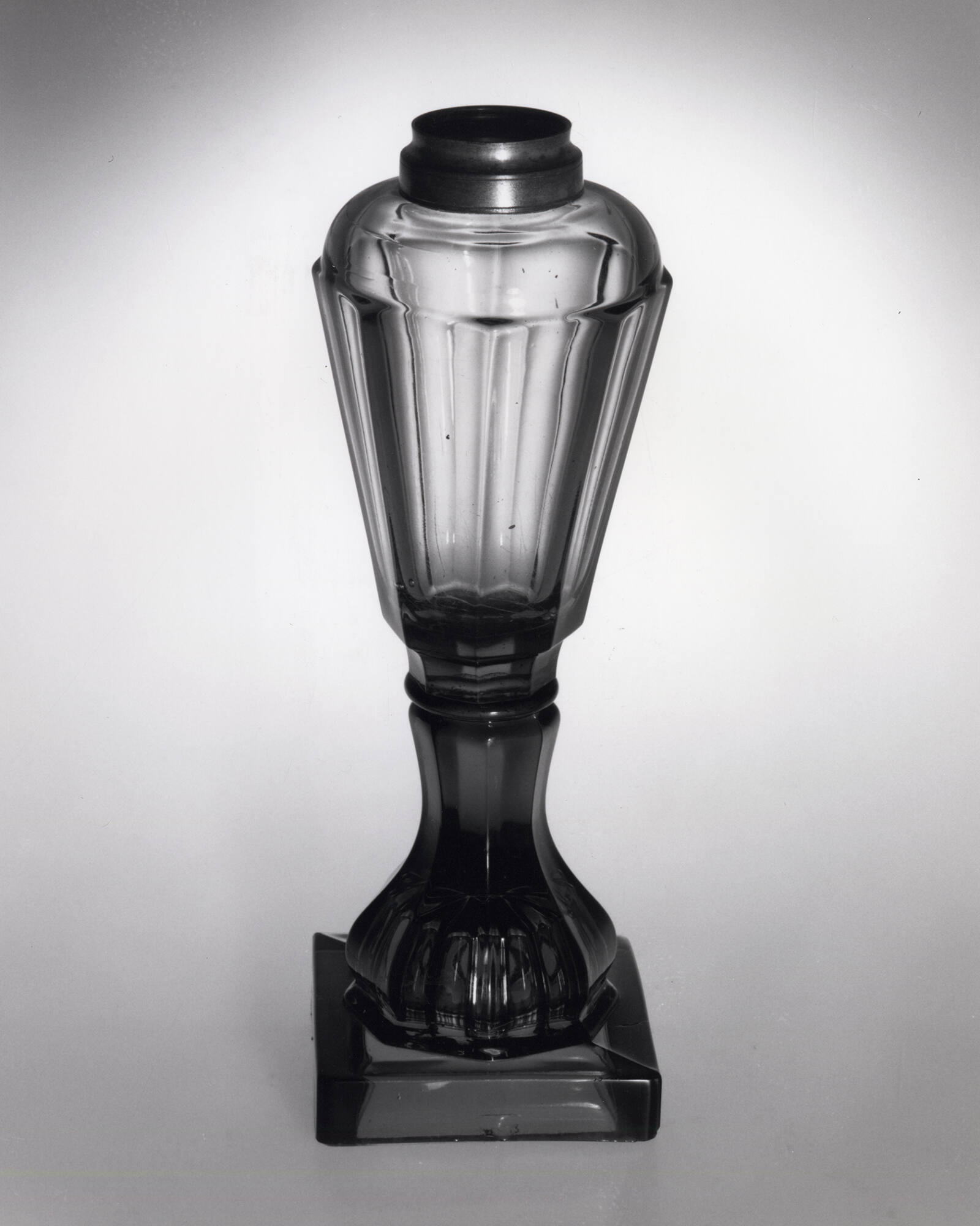 DescriptionFont and short stem pressed upright in a one-piece female mold of octagonal form, in conjunction with a one-piece cylindrical mold from which the domed top was formed by reheating and tooling, by the Magoun patent method, by a plain male plunger. Joined by a wafer to an octagonal standard on a square plinth. Standard and plinth pressed upside down in a female mold of two vertical sections by a male plunger of domed form bearing eight rounded ribs and a square shoulder. Rough pontil mark around edge of ribs. Undersurface of edge of base ground. Pewter collar machined and threaded.