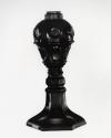 DescriptionFont pressed, probably upright, in a female mold of three vertical sections bearing the pattern, in conjunction with a one-piece cylindrical mold from which the domed top was formed by reheating and tooling by the Magoun patent method, by a plain male plunger. Joined by a wafer to a hexagonal standard and base. Standard and base pressed upside down in a female mold of two vertical sections bearing the pattern by a plain male plunger that formed the hollow interior of the conical and cylindrical base and the underside and upward tapering edge of the hexagonal foot. Intermittent pontil scars around the inner edge of the base. Pewter collar machined and threaded.