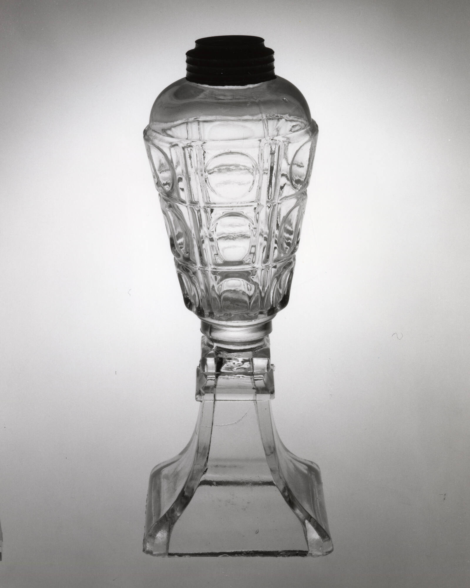 DescriptionFont blown in a full-size female mold of three vertical sections. The moldmarks extend vertically, in every other groove between the block-and-printie design, from bottom to collar. Joined by a wafer to the cylindrical top of the tapered square base. Base pressed upside down in a mold of two vertical sections by a plain male plunger, with a cap ring that formed the hollow underside of the foot. No pontil mark. Britannia-ware collar machined and threaded.