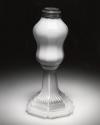 DescriptionFont and ring at its base blown in a full-size female mold of two vertical sections, each bearing a pattern of five printies. Joined directly to a hexagonal standard and base. Standard and base pressed upside down in a female mold, probably of three vertical sections, by a ribbed male plunger with stepped shoulders that formed the hollow interior, with a cap ring that formed the underside and tapered edge of the foot. No pontil mark. Britannia-ware collar machined and threaded.
