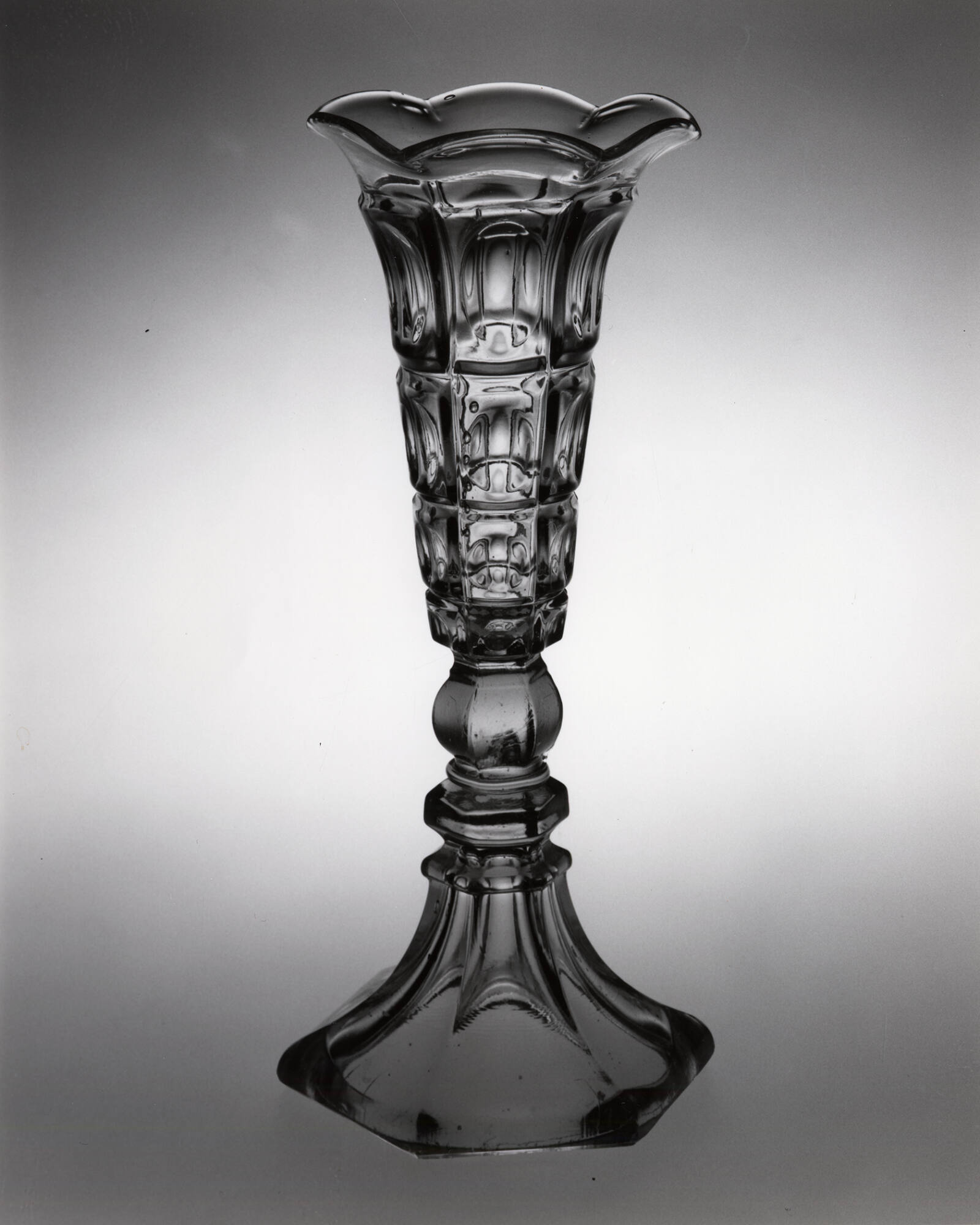DescriptionBowl pressed upright in a female mold of three vertical sections extending from the base of the solid hexagonal knop to the edge of the rim and bearing the block-and-printie pattern in six vertical panels by a plain male plunger. Joined by a wafer to a hexagonal standard and base. Standard and base pressed upside down in a female mold of two vertical sections by a plain tapered cylindrical male plunger, probably with a cap ring that formed the underside and outer angled edge of the foot. Rim reheated and tooled into six uneven flutes. No pontil mark. Underside of base ground and polished.