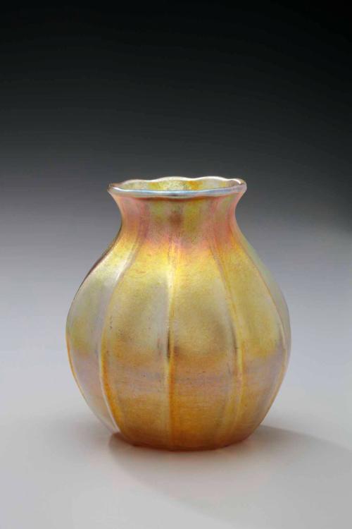 DescriptionBlown in a mold and patterned with ten vertical ribs, then finished by tooling. Gold iridescent finish. Large, concave, semipolished pontil mark.