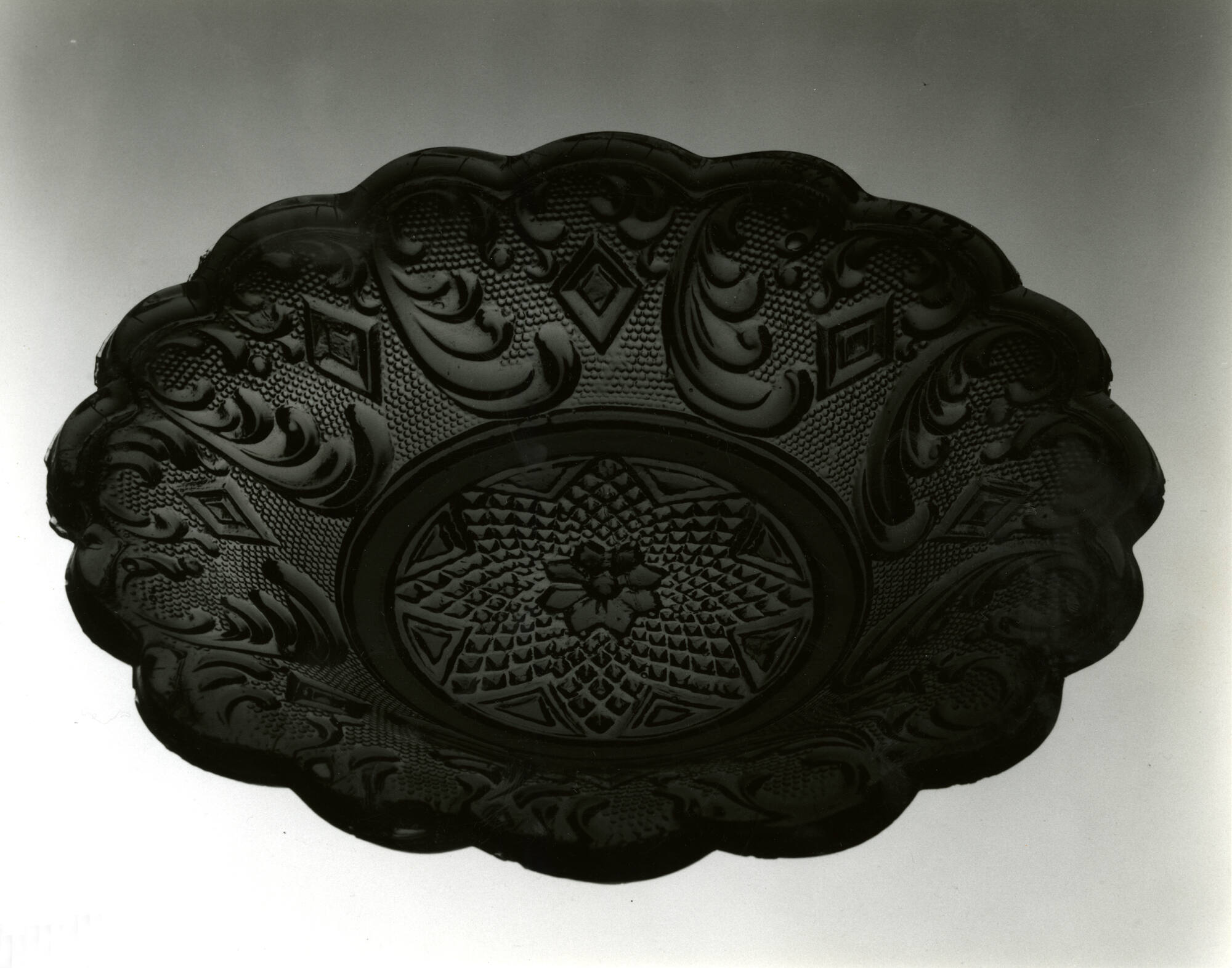 DescriptionPlume and diamond pattern with a star center, scalloped edge.