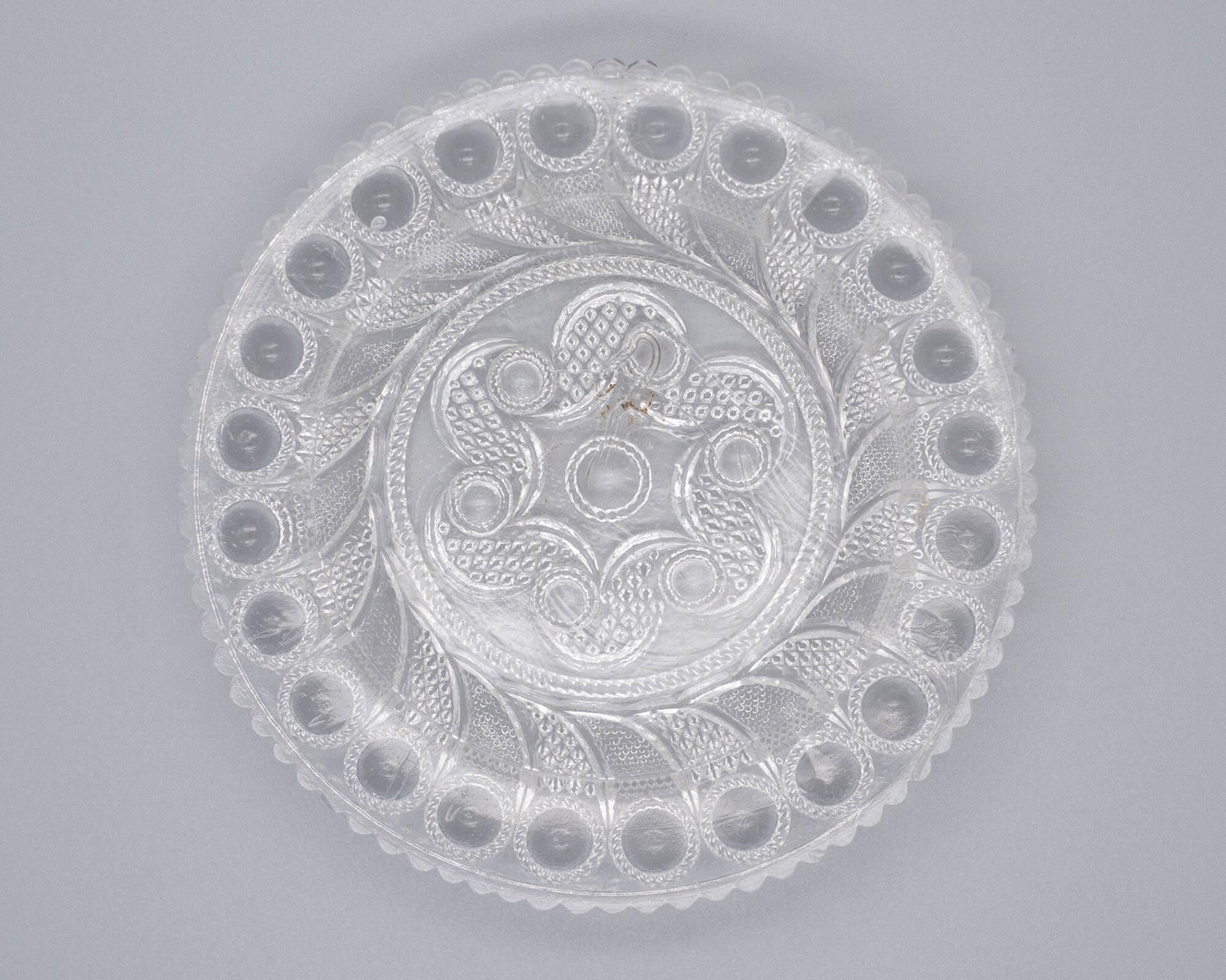 DescriptionPressed upside down over a plain male mold by a female plunger bearing the pattern. Rope foot ring. Slight shear mark on patterned underside of base.