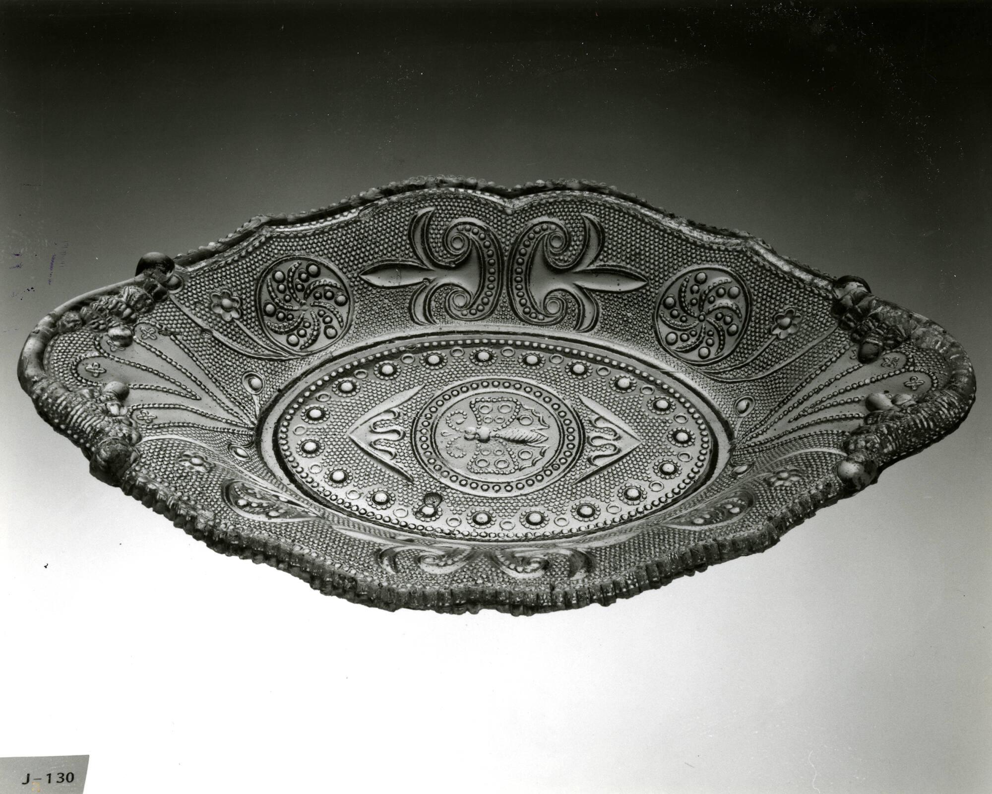 DescriptionPressed upside down over a male mold, plain except for the serrations on the side edges and stylized palmettes on the ends, by a female plunger bearing the balance of the pattern. Plain flat foot ring. Shear mark barely evident on patterned underside at end of foot ring.