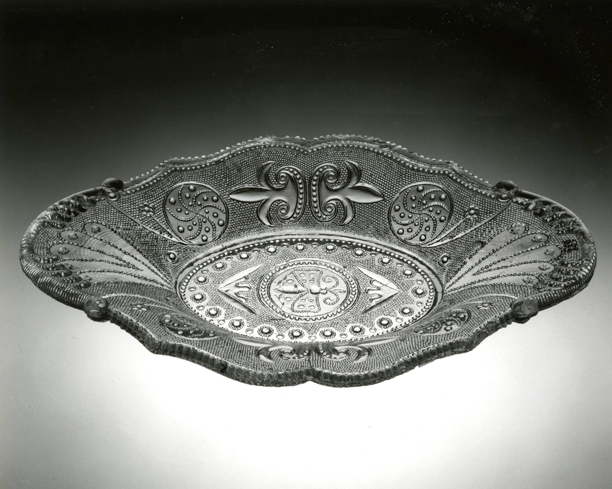 DescriptionPressed, probably upside down, over a male mold, plain except for the pattern that formed the curved decoration and bosses at each end of the tray and the tapered finely scalloped rim edge, by a female plunger bearing the balance of the pattern. Plain flat narrow ring.