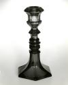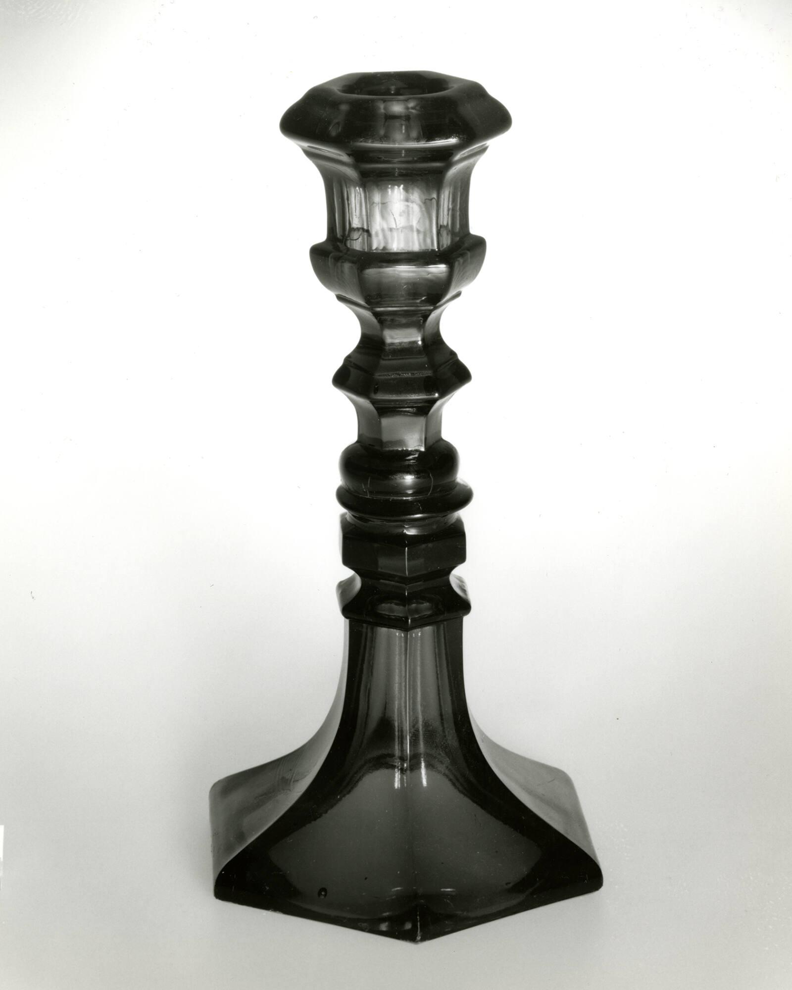DescriptionHexagonal socket and stem ending in a circular cushion: pressed upright in a female mold of two vertical sections by a plain cylindrical male plunger with a slightly rounded end. Joined by a thin wafer to a hexagonal base. Base: pressed upside down in a female mold of two vertical sections by a plain male plunger of tapered cylindrical shape that formed the hollow interior and underside of the hexagonal base and the short angular shape on the under edge of each hexagonal section of the base.