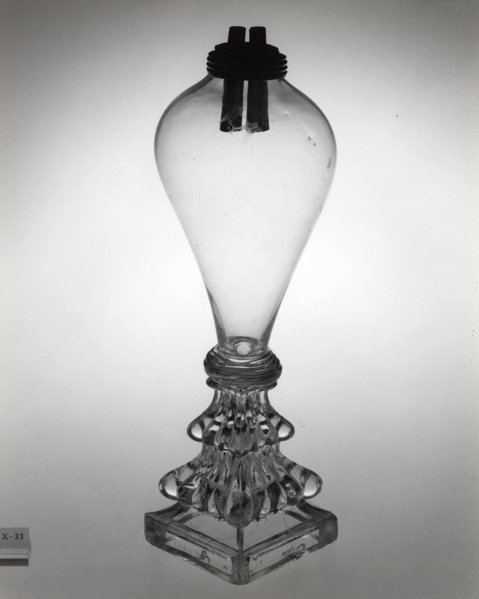 DescriptionFont blown and finished by tooling. Joined by a multiribbed knop to the base. Base pressed in a female mold, probably of four vertical sections, by a plain male plunger of square cross section, tapered and stepped, that formed the hollow interior and undersurface of the base. Pewter collar machined and threaded, with double-wick pewter-and-tin burner for whale oil.