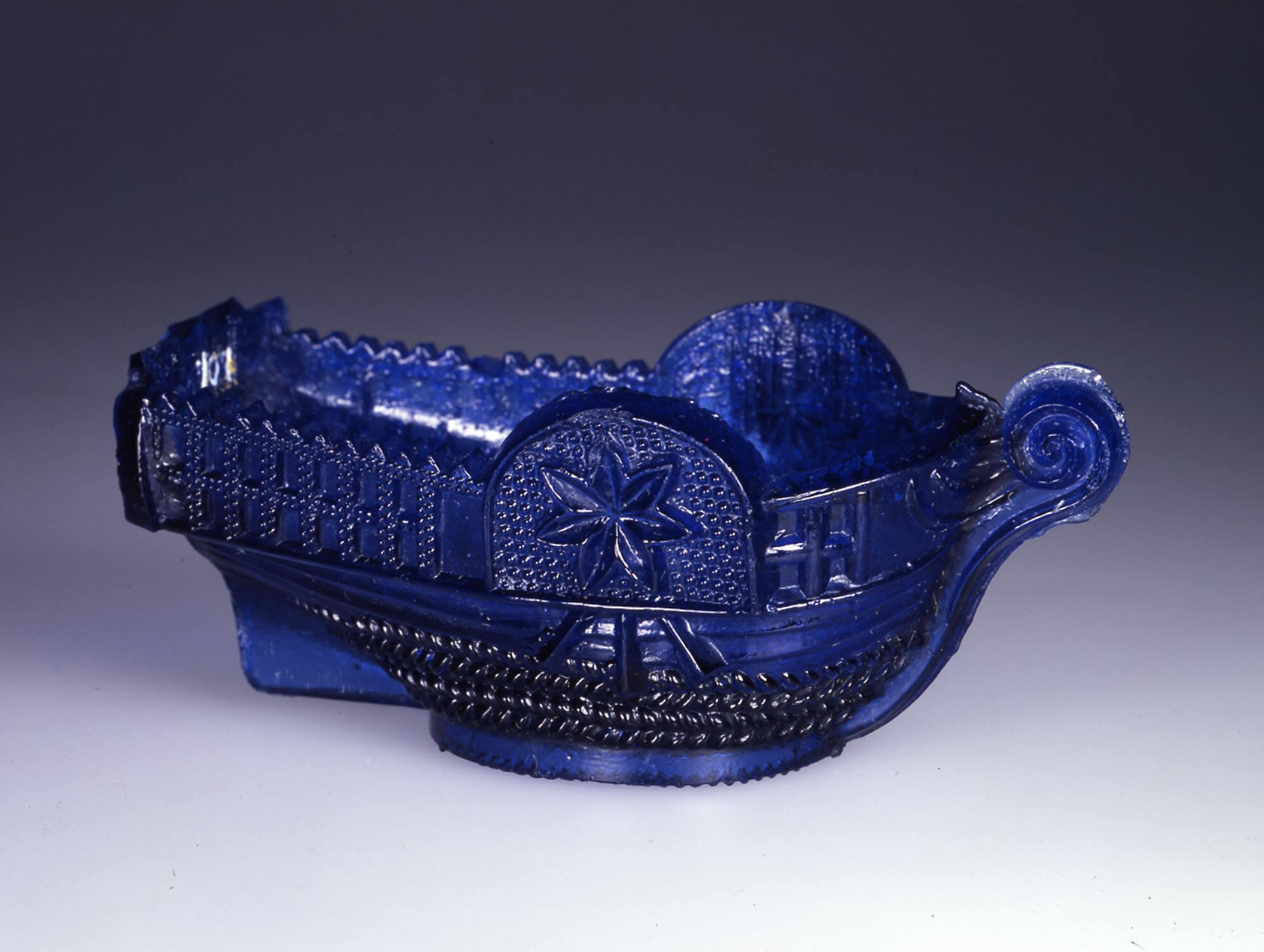 DescriptionPressed upright, probably by a bench press, in a female mold of three vertical sections (two sides and stern), with a base plate that formed the rope-patterned foot ring and a recessed base with an anchor whose bottom points toward the bow on a stippled background, by a plain male plunger. Shear mark on interior of base.