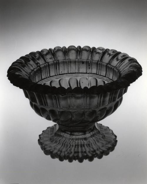 DescriptionPurplish blue glass. Pressed upright in a female mold of four vertical sections bearing the pattern by a plain male plunger that formed the interior, with a cap ring that formed the upper surface of the broad rim. A patterned, convex male plunger formed the interior of the foot and its alternately scalloped and pointed edge. The four mold seams extend from the top edge of the foot straight up to the underside edge of the rim. No pontil mark.