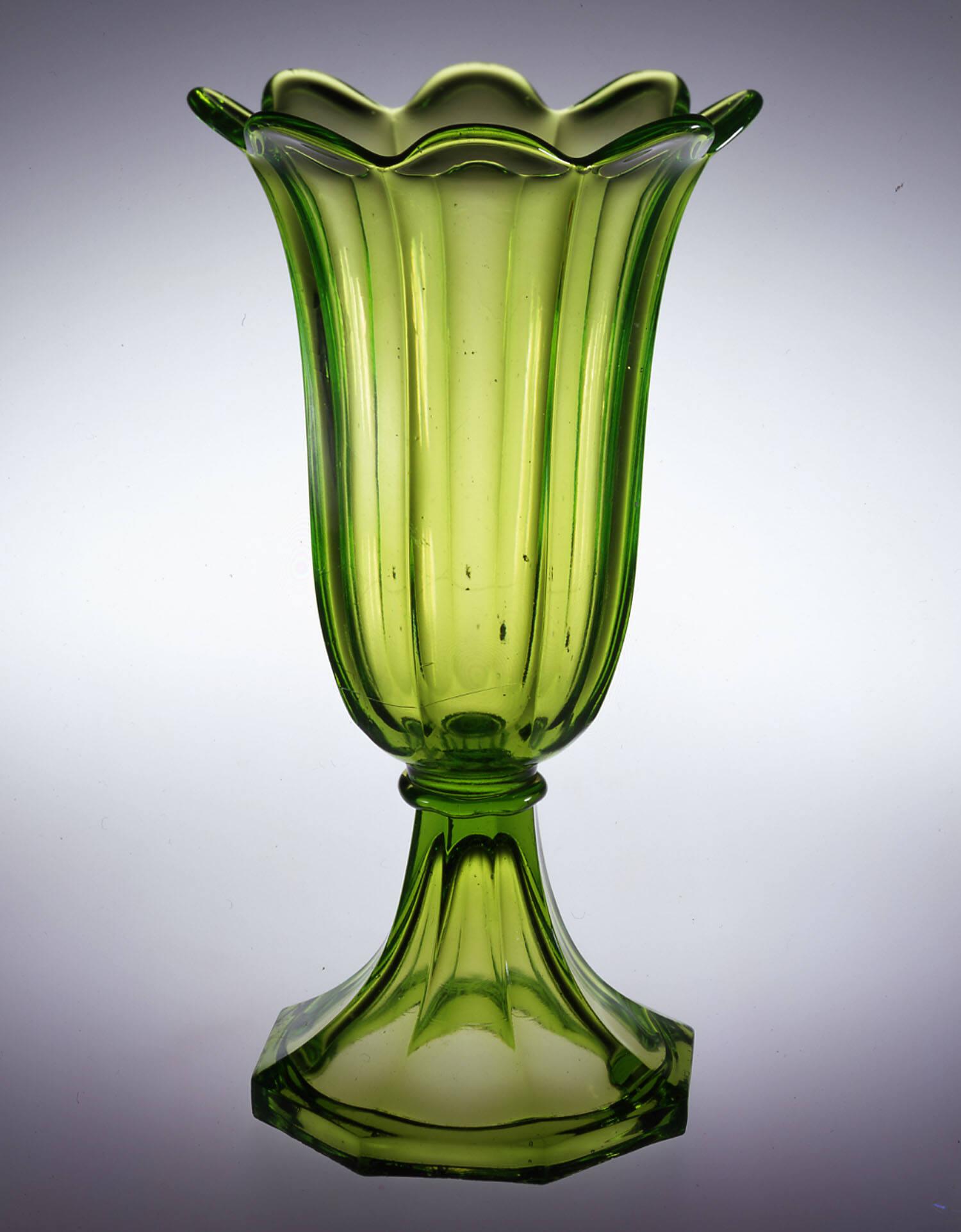 DescriptionMade in the same manner as 1968.43A but pressed in different molds with minor variations: (1) the eight panels on the bowl terminate in rounded ends about 1.2 cm (1/2 in.) from the base, and (2) the cylindrical stem is shorter and larger in diameter. Pontil mark on underside of edge of base. Rim and upper part of bowl highly fire-polished.
