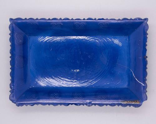DescriptionCasket: pressed upright in a female mold of four vertical sections, opening at the corners, with the sides bearing a pattern of ribs with Gothic arches and hearts on the body and a vesica-and-dome pattern on the rim, with a base plate that formed the almost flat base with 20-rayed elongated medallion, by a plain male plunger that formed that interior and probably the top rim of alternating shallow arches and points. Cover: pressed upside down in a plain one-piece female mold, in conjunction with a female mold of two sections opening diagonally that formed the finial, by a male plunger bearing a pattern of three arches on each side and on each end, with three rows of short ribbing on each corner, and two four-pointed stars at each end of its lower section. Tray: pressed upside down over a plain male mold that formed the interior and exterior of the alternating shallow scallop-and-point rim by a female plunger bearing the pattern of hearts and stars on the sides and conventional pattern on the base, with a cap ring that formed the underside of the rim and the narrow vertical edge below it. The foot ring is a fine cable on the outer edge of a flat band.